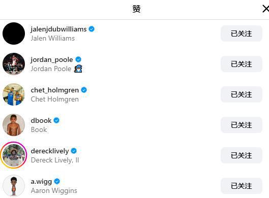 小编捕捉到,点赞的NBA年轻人包括布克、普尔、杰伦威、切特、莱夫利和阿隆-维金斯。其中,还在打总决赛的雷霆就占了三人。